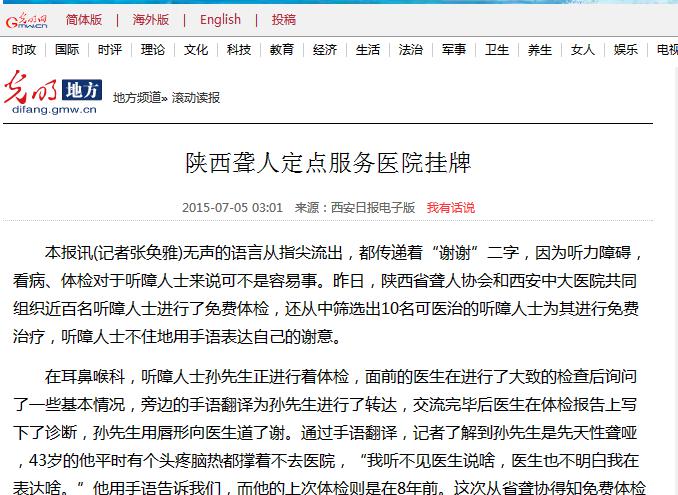 本报讯(记者张奂雅)无声的语言从指尖流出,都传递着“谢谢”二字,因为听力障碍,看病、体检对于听障人士来说可不是容易事。昨日,陕西省聋人协会和西安新城中大耳鼻喉医院共同组织近百名听障人士进行了免费体检,还从中筛选出10名可医治的听障人士为其进行免费治疗,听障人士不住地用手语表达自己的谢意。原文链接:http://difang.gmw.cn/newspaper/2015-07/05/content_107675678.htm
